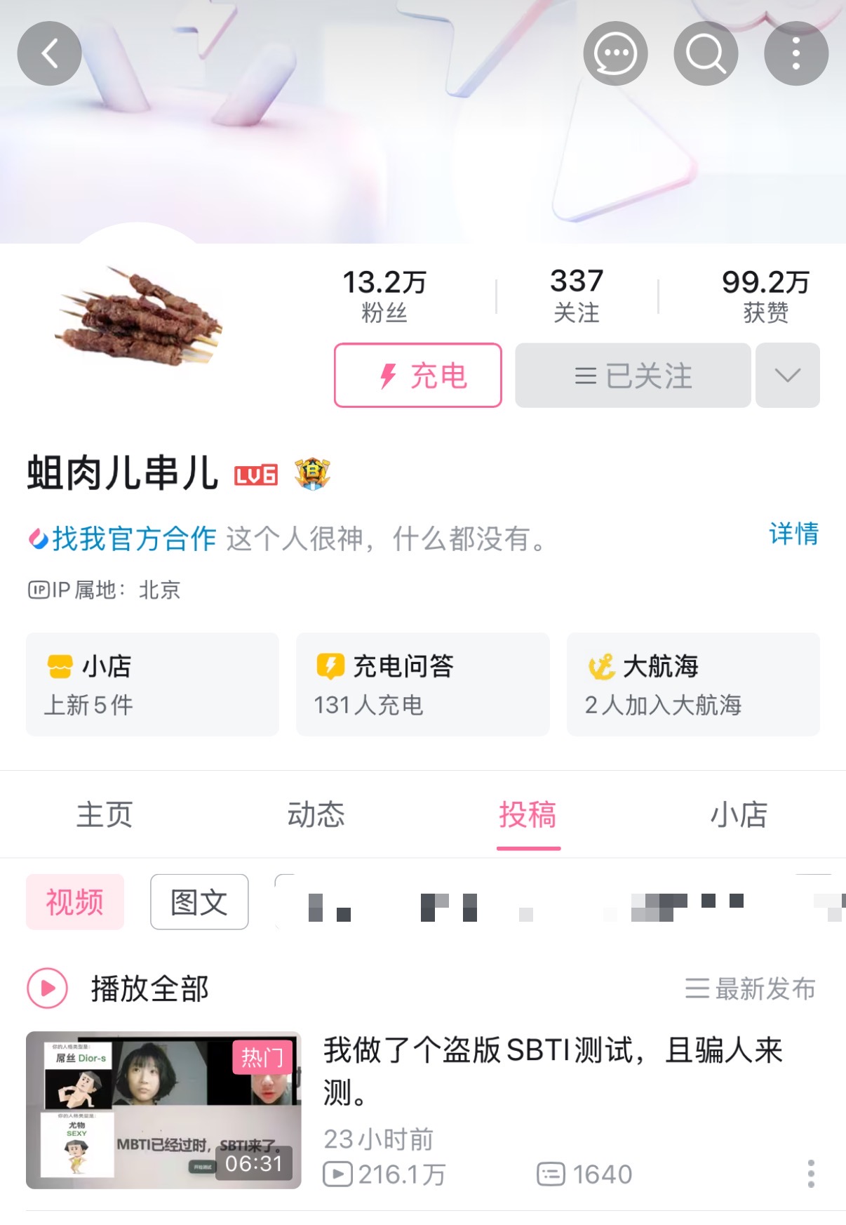 据悉,SBTI由B站UP主“蛆肉儿串儿”创作,她于4月9日发布标题为《我做了个盗版SBTI测试,且骗人来测》的视频,发布仅23小时,播放量超过200万。该人格测试发布后,链接一度崩溃,up主于4月10日凌晨4点左右在评论区表示:“按照建议做了略微修改,应该不会再崩了。”