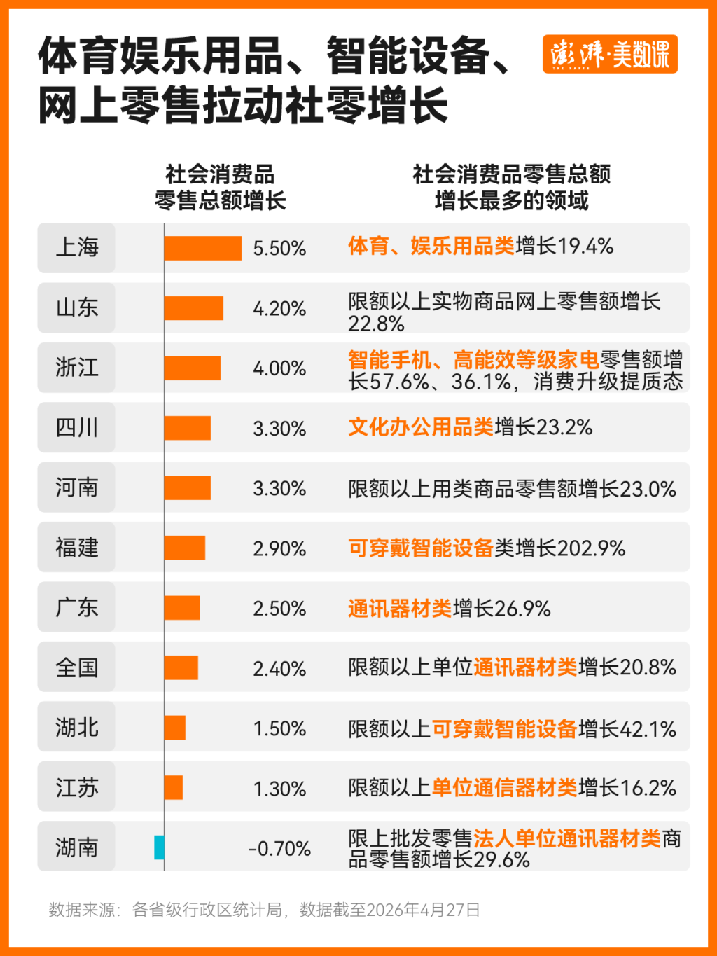 从经济大省的数据可以看到证券配资的条件,拉动消费增长的动力主要来自体育娱乐用品、智能设备、网上零售。比如,上海一季度体育、娱乐用品类零售额增长19.4%,浙江一季度智能手机、高能效等级家电零售额增长57.6%、36.1%,福建一季度可穿戴智能设备类零售额增长202.9%。
